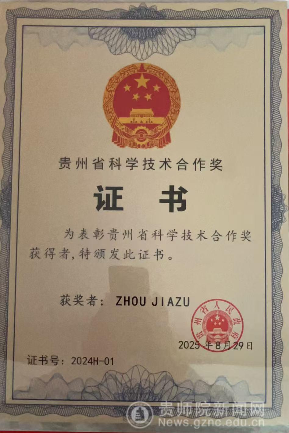喜报:数学与大数据学院学术院长周家足教授荣获2024年度贵州省科学技术合作奖