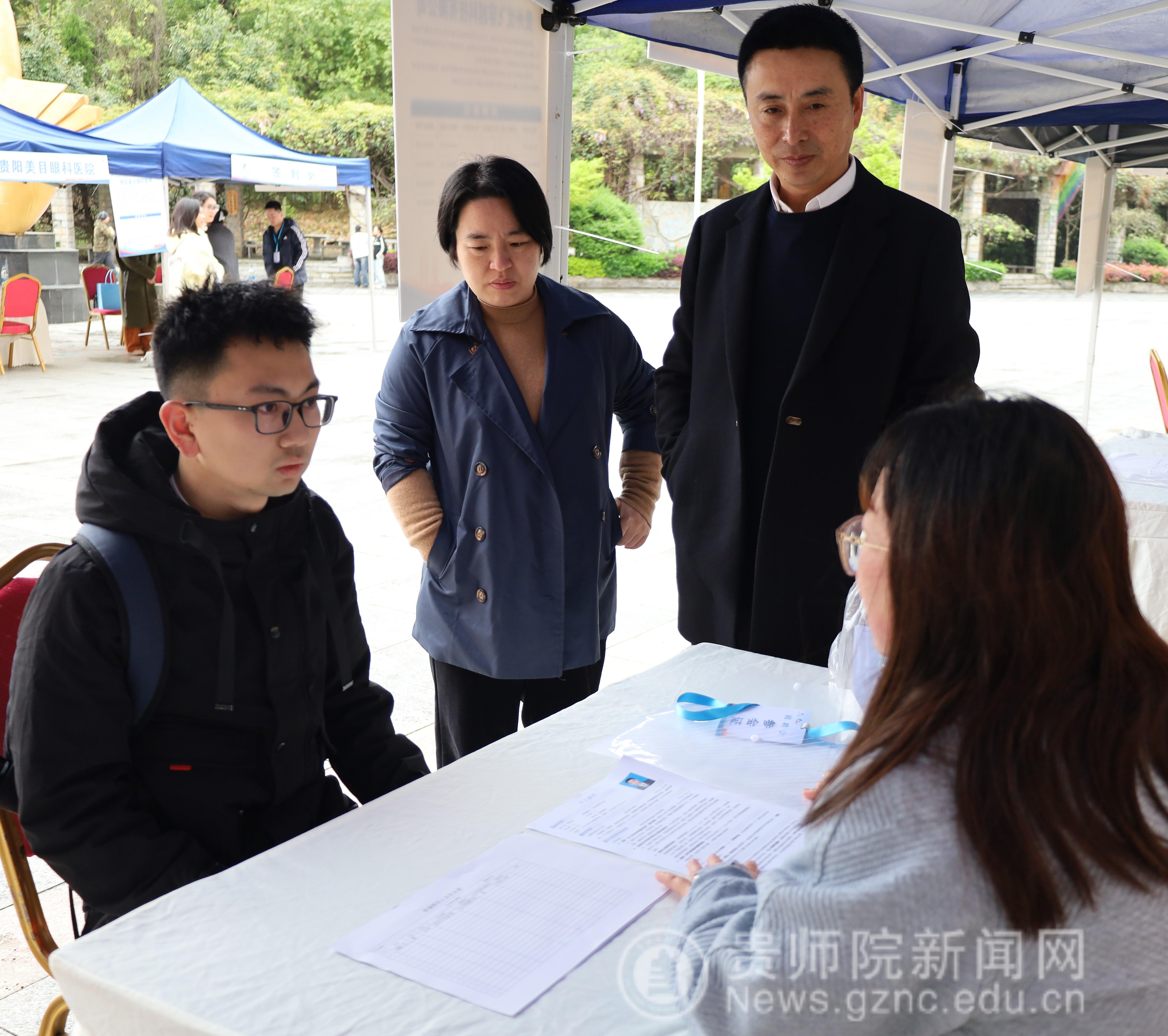 活动现场,数学与大数据学院院长熊伟程、副院长廖玉梅亲临招聘会现场,与贵阳市观山湖区人社局工作人员深入交流,详细了解企业招聘需求、校地就业合作推进情况,共同谋划毕业生就业服务提升举措。领导们逐一走访企业展位,关心毕业生简历投递、求职洽谈进展,鼓励同学们把握春季求职黄金期,主动出击、理性择业。