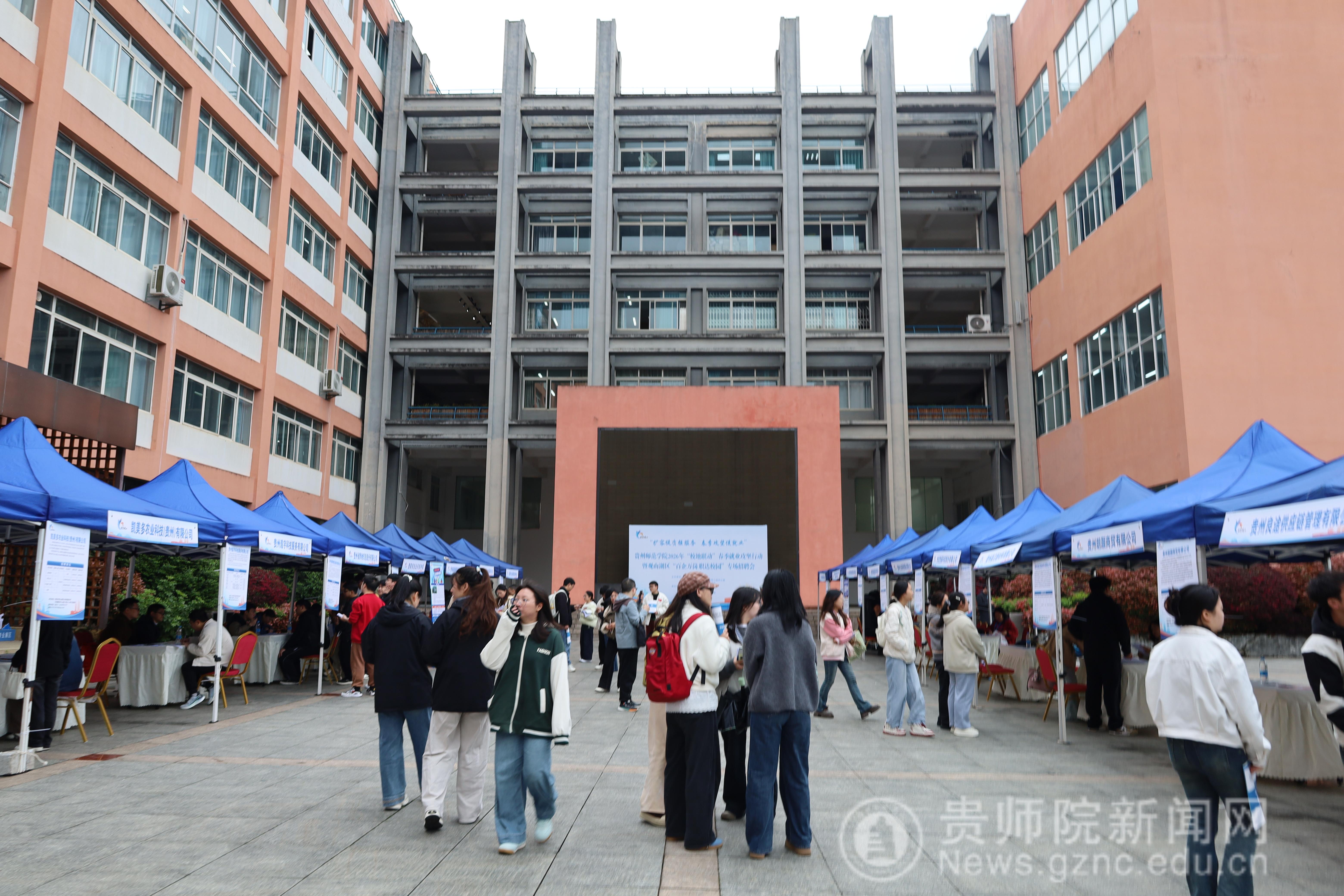 为落实教育部2026届高校毕业生就业扩容提质行动工作要求,抓住春季开学后促就业工作攻坚期,全力促进我校2026届毕业生高质量充分就业。3月27日,贵州师范学院2026年“校地联动”春季就业攻坚行动暨贵阳市观山湖区“百企万岗 职达校园”专场招聘会在贵州师范学院圆满举办。本次招聘会由数学与大数据学院、观山湖区就业局、观山湖区人才交流服务中心联合承办。