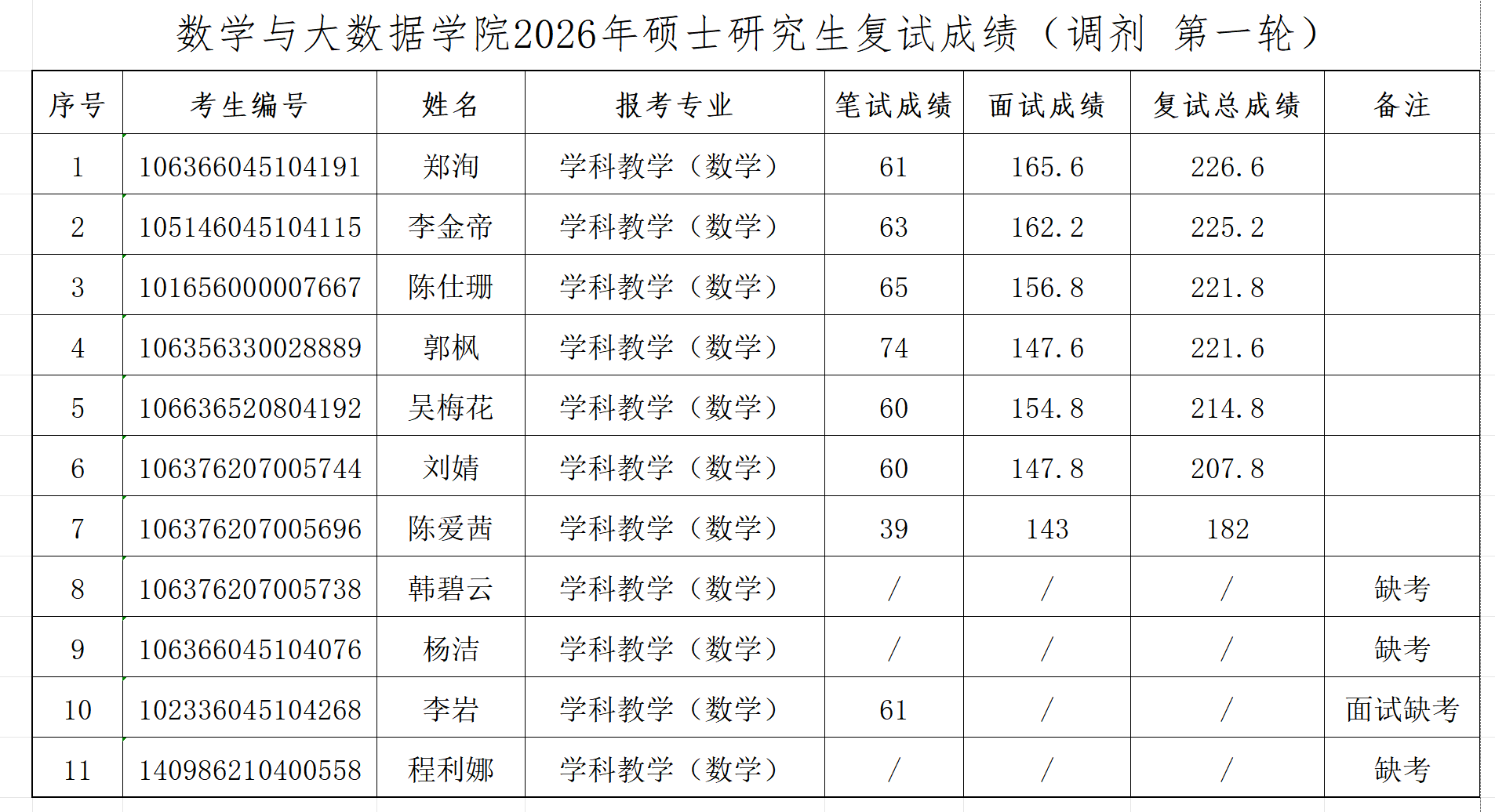 数学与大数据学院2026年硕士研究生复试成绩(调剂 第一轮)