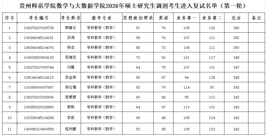 贵州师范学院数学与大数据学院2026年硕士研究生调剂考生进入复试名单(第一轮)